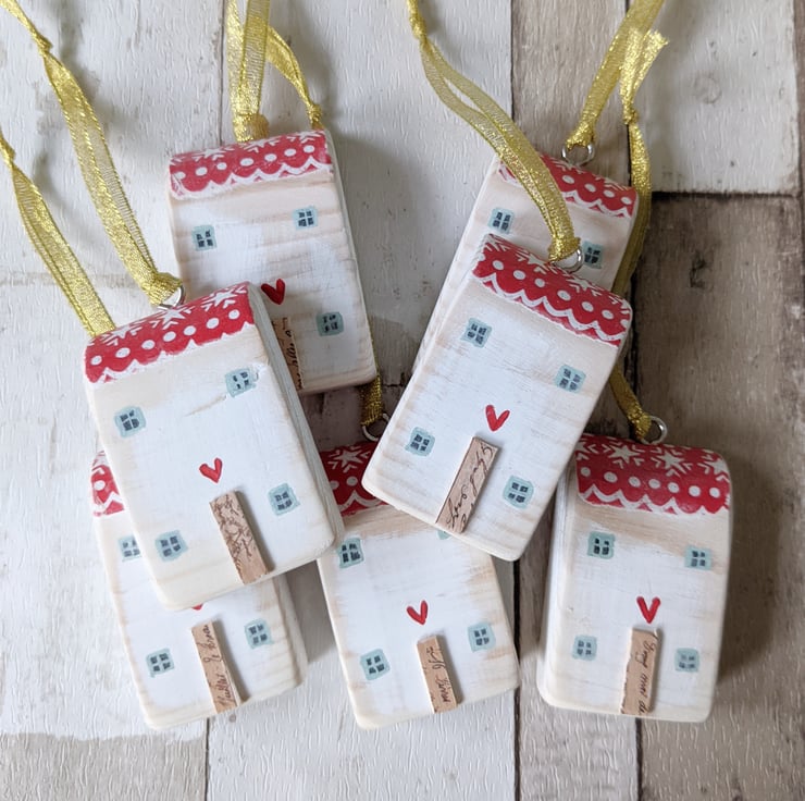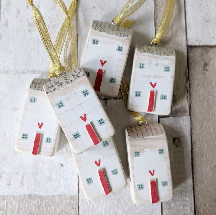 Hand painted with teeny windows and wooden front doors these one of a kind houses hang on a gold ribbon.