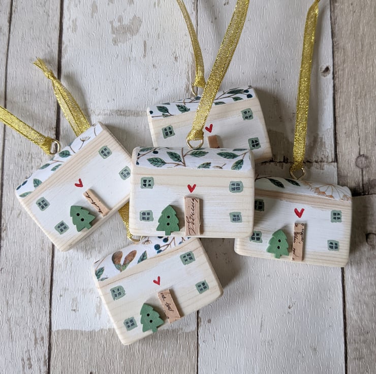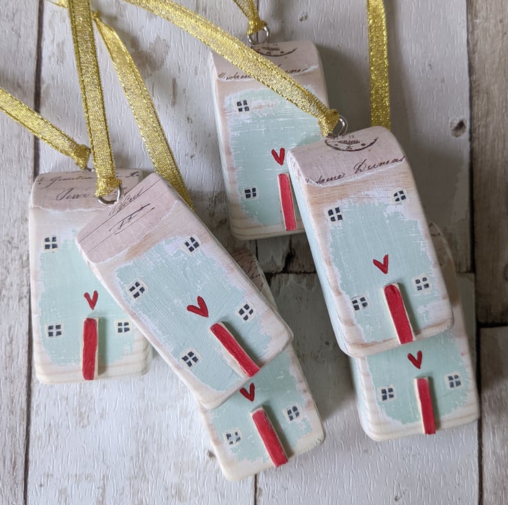 Hand painted with teeny windows and wooden front doors these one of a kind houses hang on a gold ribbon.