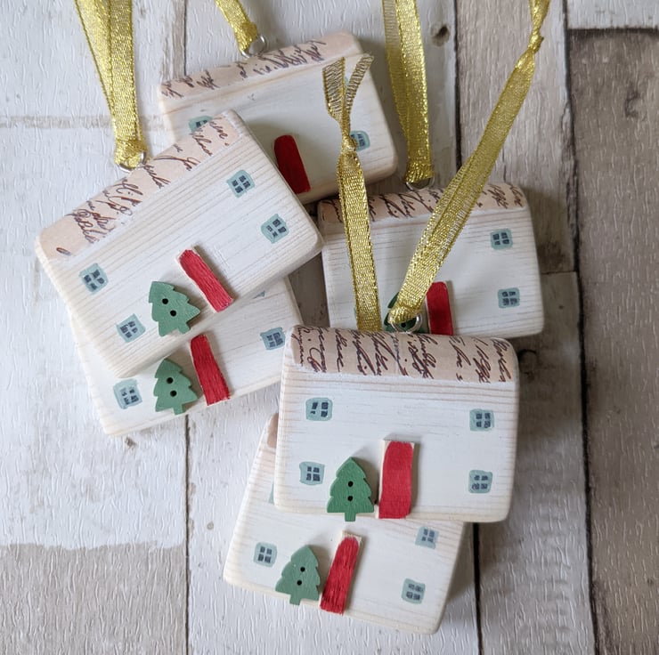 Hand painted with teeny windows and wooden front doors these one of a kind houses hang on a gold ribbon.