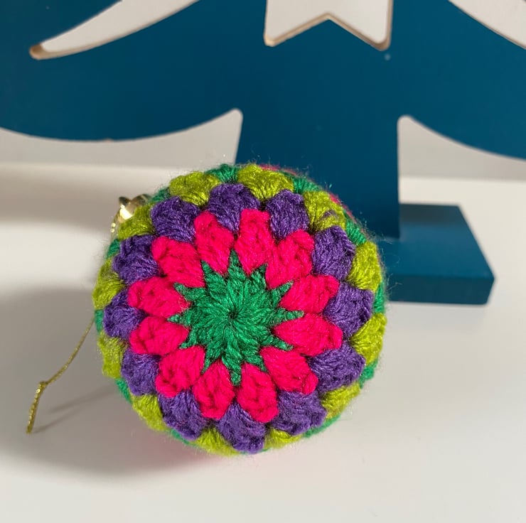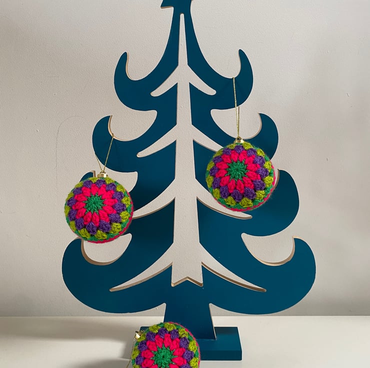 Each bauble is approx 60mm in diameter and is handmade in acrylic yarn wrapped around a plastic bauble. They have a gold thread loop for easy hanging.