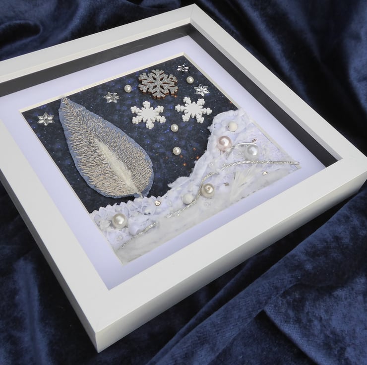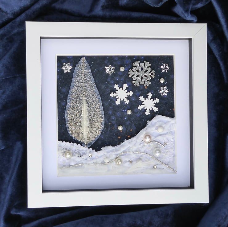 A wintery scene with snow covered hills, a frosty white tree and snowflakes falling in a night sky.