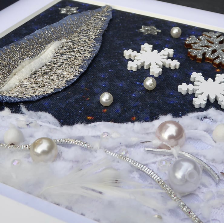 Made with remnant and recycled materials including snowflake decals from used gift tags, a broken bangle, and beads and fabric remnants including a galaxy printed background.