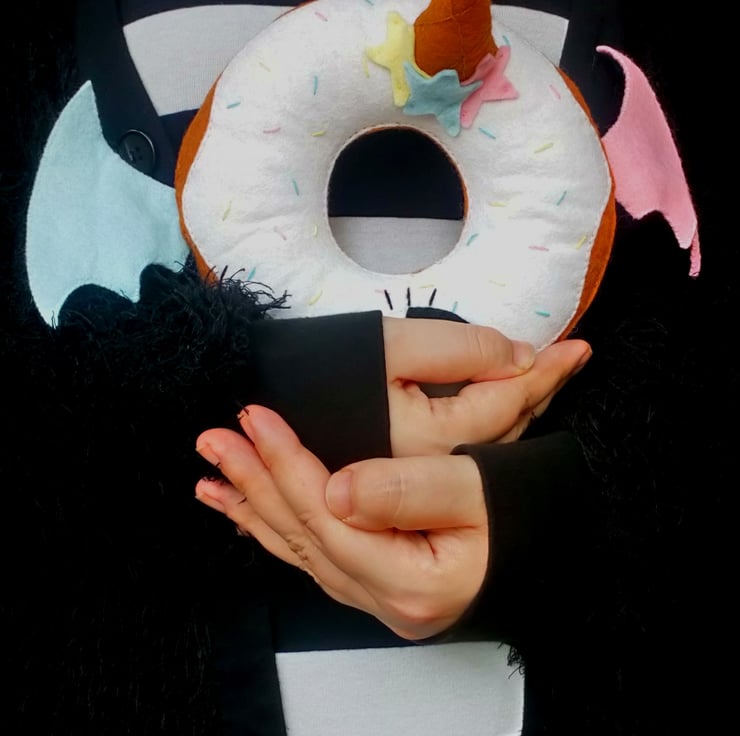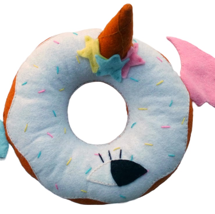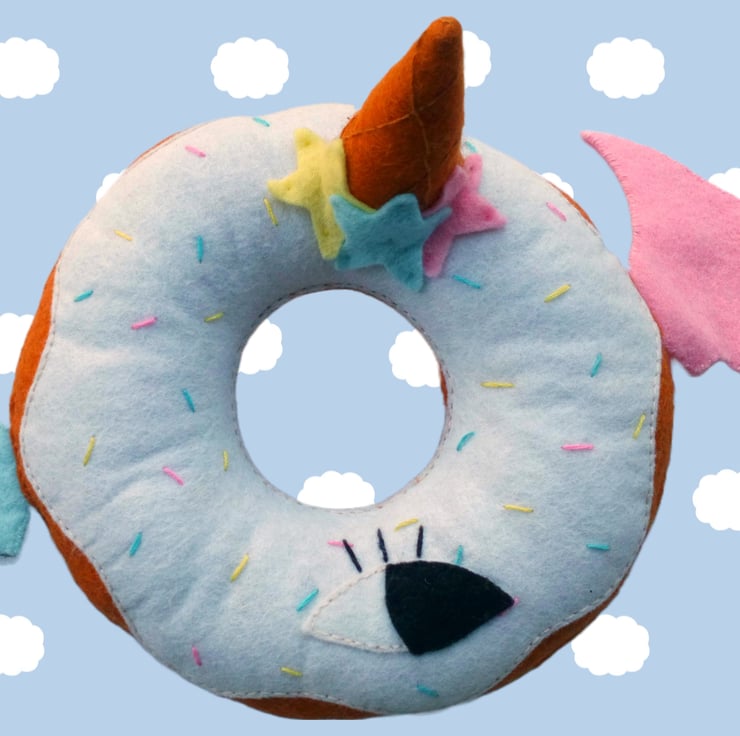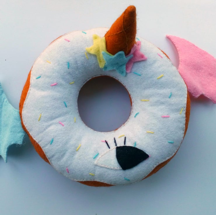 This yummy scrummy one of a kind donut friend has been lovingly made by hand with fine wool mix felt. The donut features white icing, covered in confetti (blue, yellow, pink) sprinkles and topped off with a mini cone, which has some super cute pink, blue and yellow stars added for a little bit of charm. But of course that's not enough! Along with a cute eye detail, it also has blue and pink wings so it can fly (this has not been proven..)
