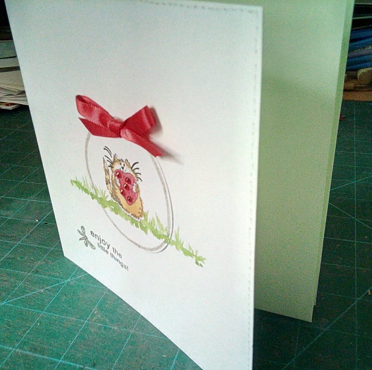 A completely different and handmade card. Consisting of a cutie cat with heart stamped onto a circle of white card. Then mounted onto quality pristine white card. Hand coloured with water colours. Embellished with red rhinestones and red satin ribbon