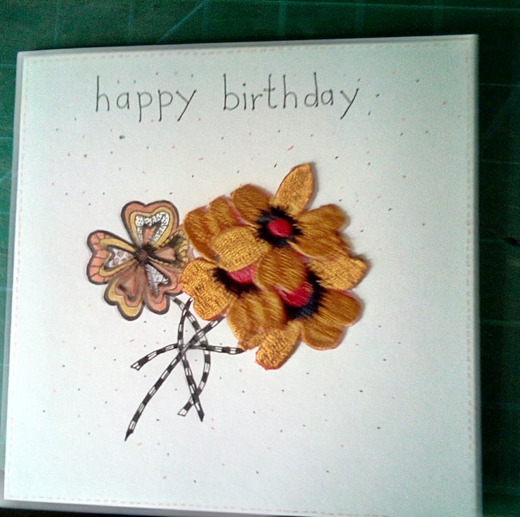 A completely handmade and uniquely designed card. Consisting of 3 beautiful cotton embroidered daisies mounted onto quality pristine white card. Embellished with a further modern hand drawn and coloured daisy.