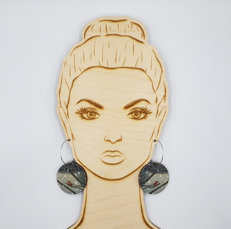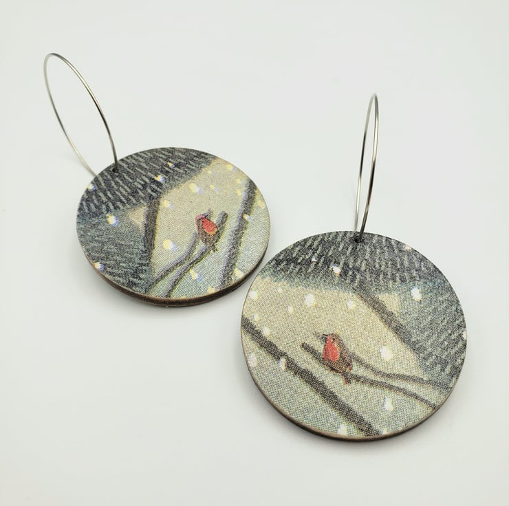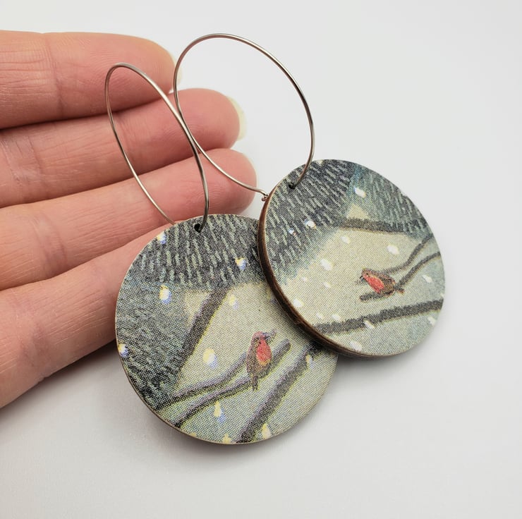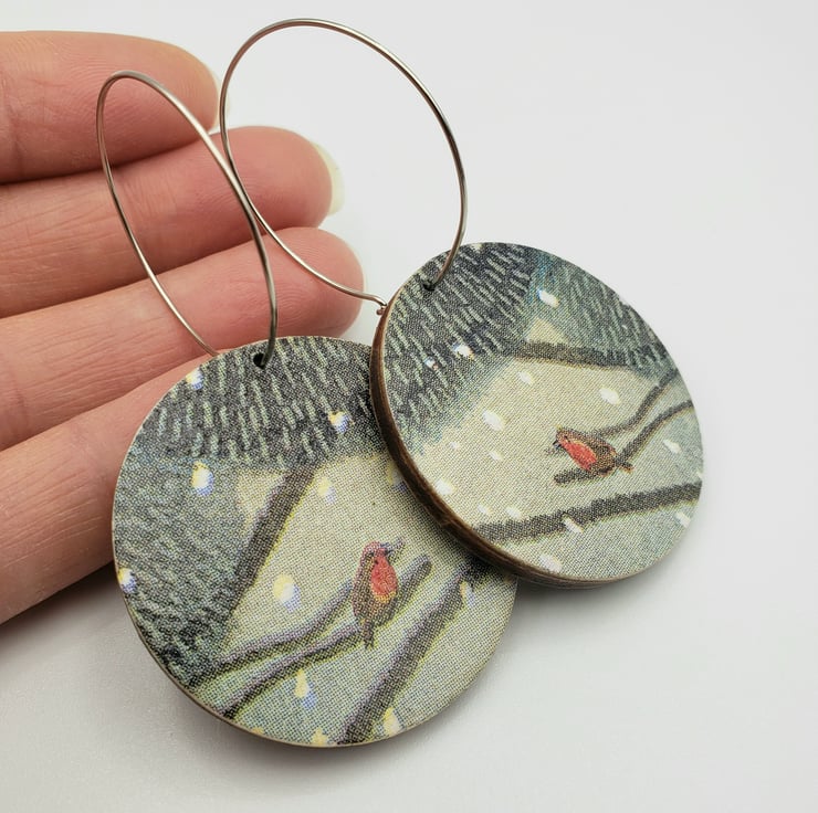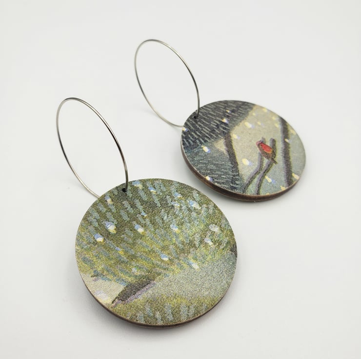 These gorgeous 'little red robin' christmas hooped earrings are perfect for for the festive season. It's sitting on a wooden branch in a snowy woodland scene. The image is slightly blurry, this is on purpose to give the effect of fluttering snow.