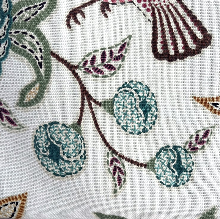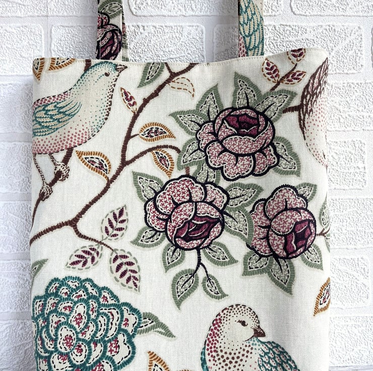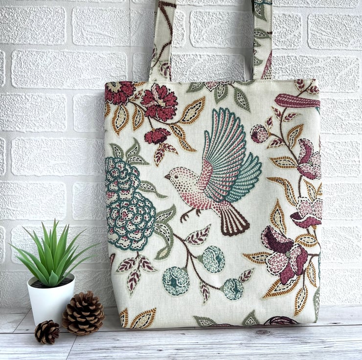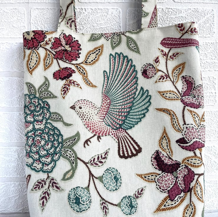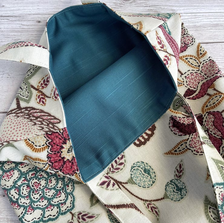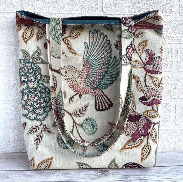 Flying bird and floral tote bag. This useful tote bag is made from fabric with a lovely print pattern in shades of teal, magenta, dusky pink, golden brown, pale green, brown and black on a cream background. The pattern features a bird in flight amongst branches of flowers and foliage. The pattern is a lovely stylised design, and parts of it are made up of dashes, crosses and dots to give the impression of a stitched design. The bag is lined with teal fabric which co-ordinates beautifully with the teal accents in the pattern of the outer fabric.