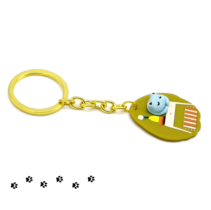 A cute keyring featuring an adorable raised blue cat on a green acrylic background.