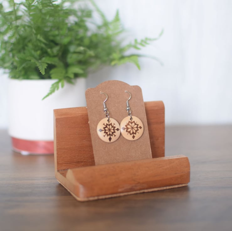A pair of wooden hand burnt pyrography earrings featuring a Nordic style snowflake design on surgical stainless-steel hooks