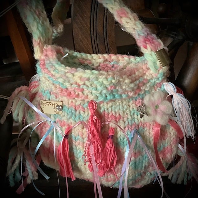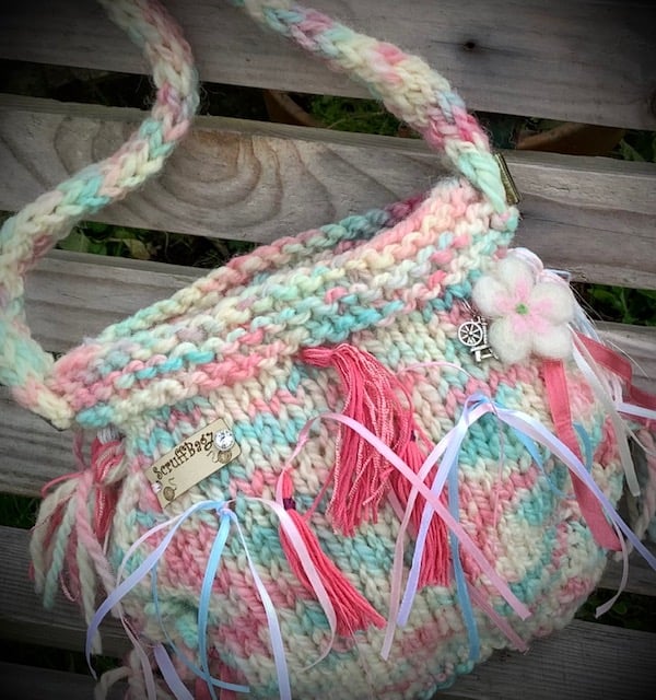 Look closely and you will find a spinning wheel charm ... a sign on the Scruffbagz of hand spun yarn. The bag is not rigid, being knitted.