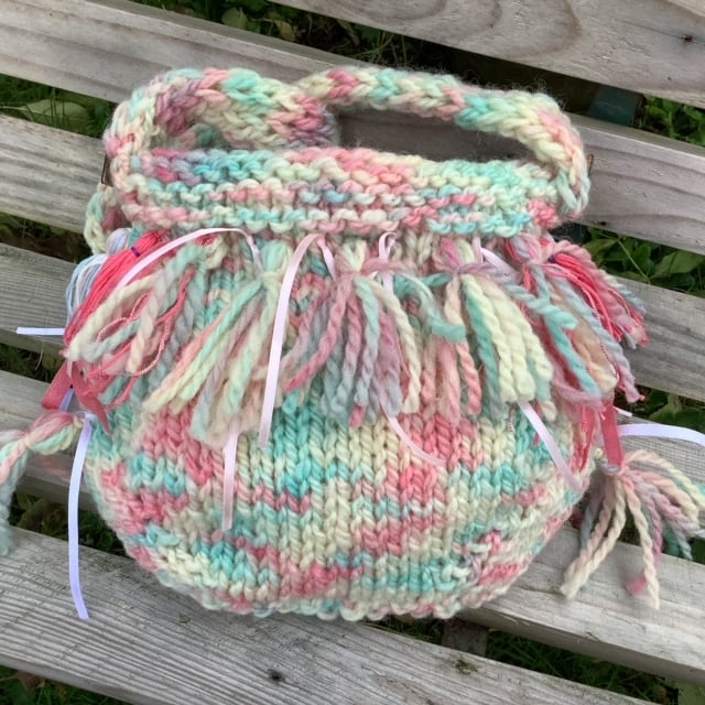 For this bag I chose a chunky 'Fairy Floss' yarn in pink, white and blue ... just like the fairground candy floss. The pastel coloured yarn is complemented with matching ribbons and tassels. Note: the white is not a 'brilliant white', but more of an off white.