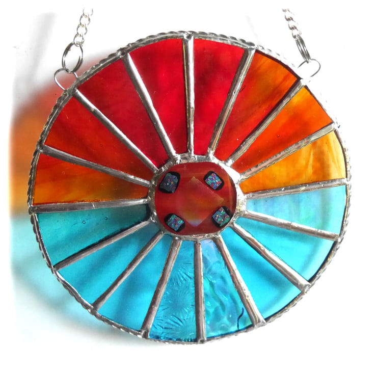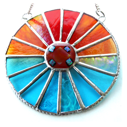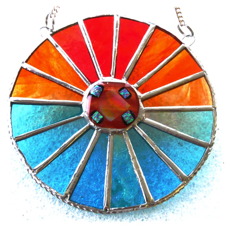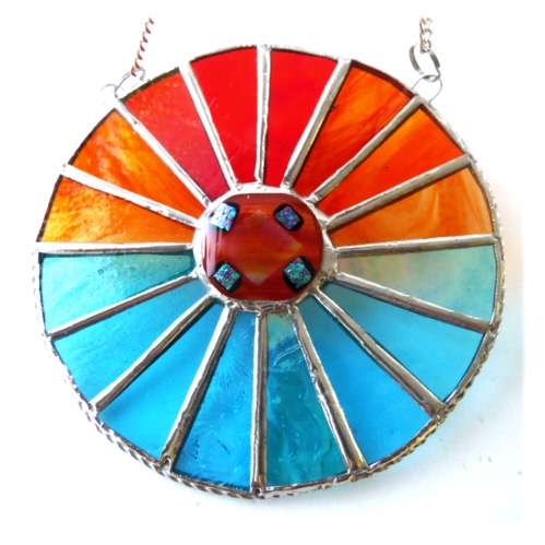 I've fused a 4cm gorgeous nugget with dichroic highlights in my kiln and then set this inside a 16 segmented circle of wonderful sunset and sea colours.