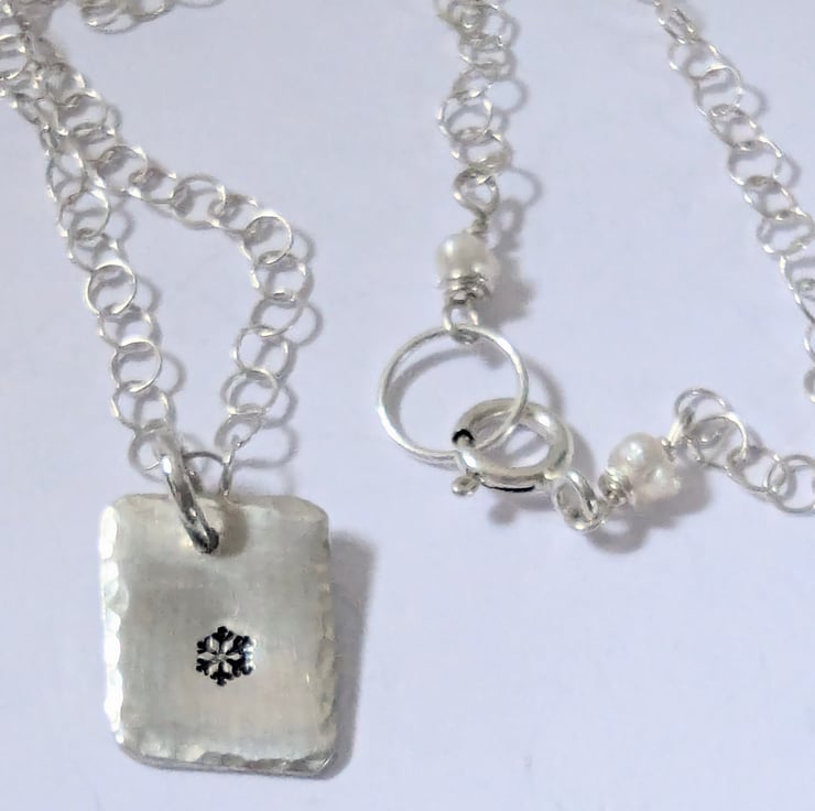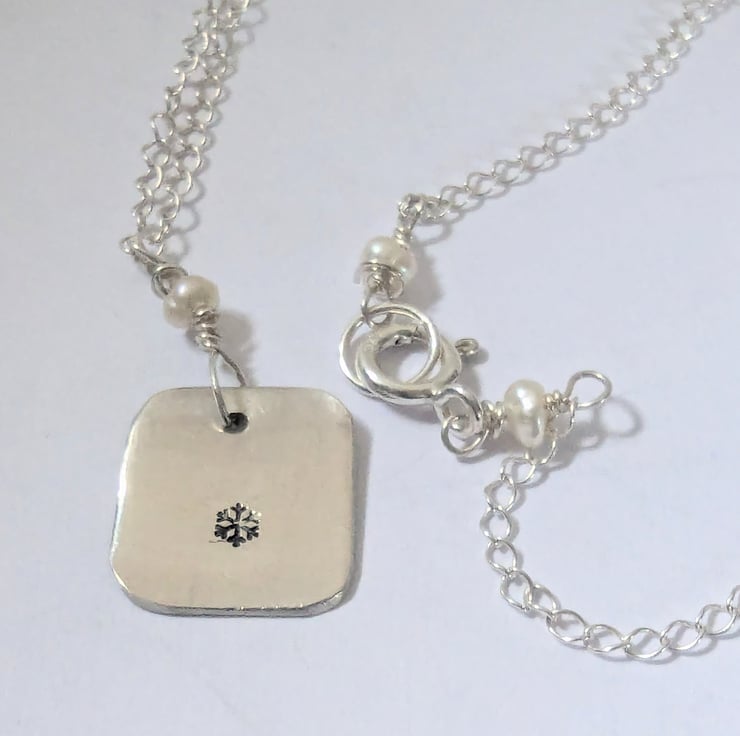 I wanted to make a little Christmas or winter silver necklace and was drawn to this cute little snowflake stamp. I cut each necklace into a slightly quirky rectangular shape and used freshwater pearls on either side of the clasp to finish them off.
