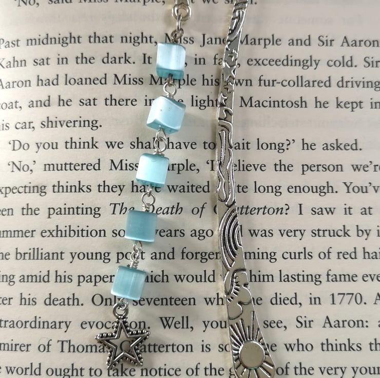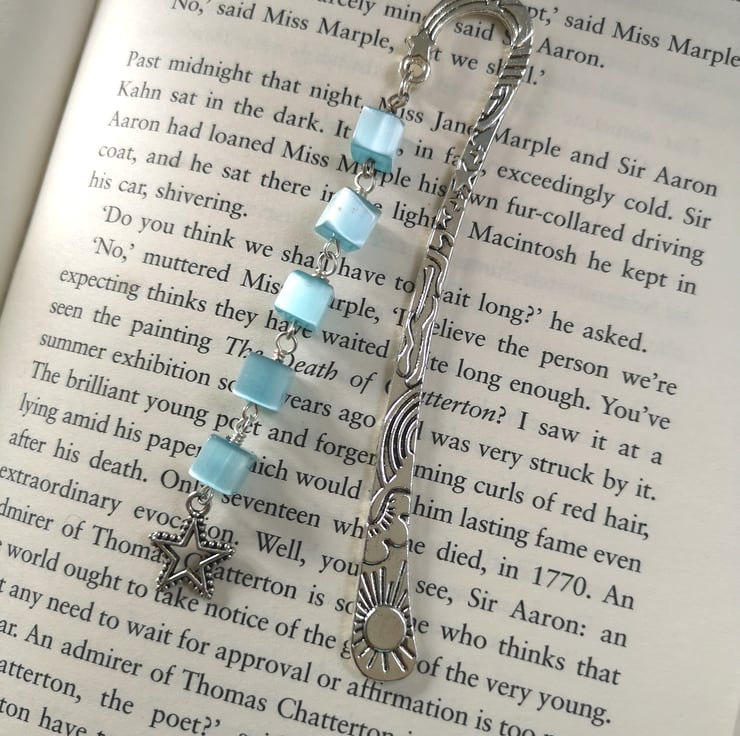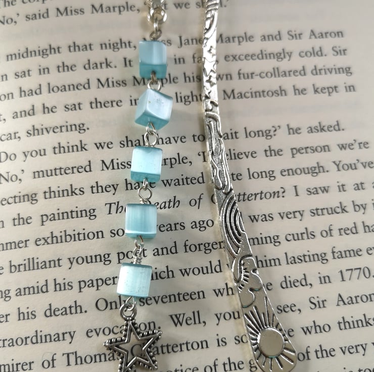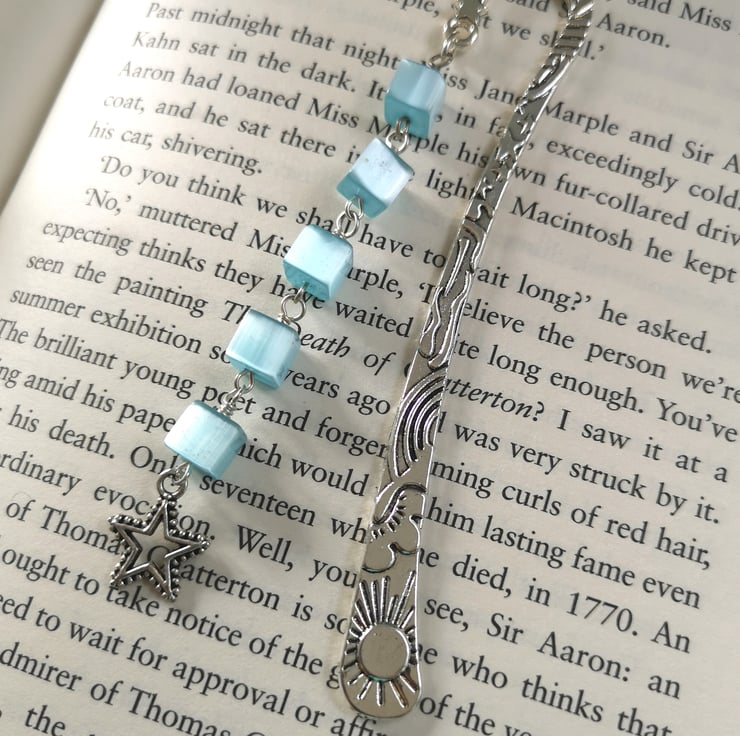 This bookmark features a little star charm hanging beneath five pale blue cube shaped beads. The main body of the bookmark is decorated with suns and stars.