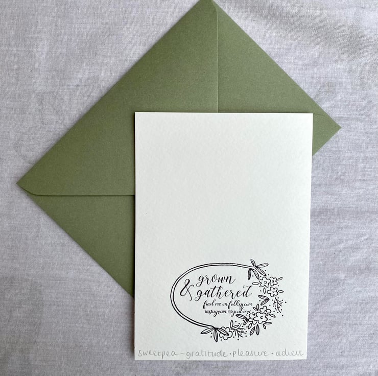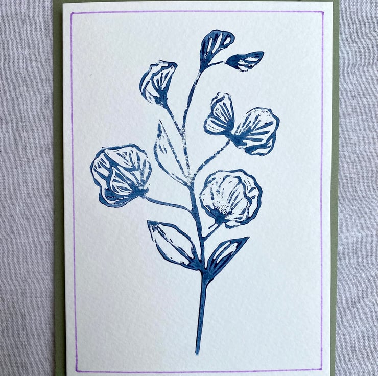 An A6 card featuring my linocut of a Sweet pea flower, based on an original flower pressing.