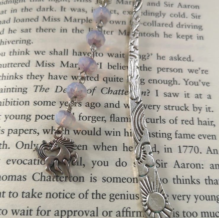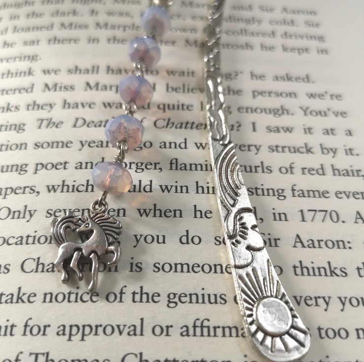 This bookmark features pale lilac glass beads with a unicorn charm hanging beneath. The main body of the bookmark is decorated with suns and stars.