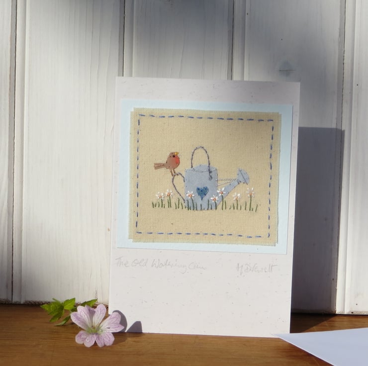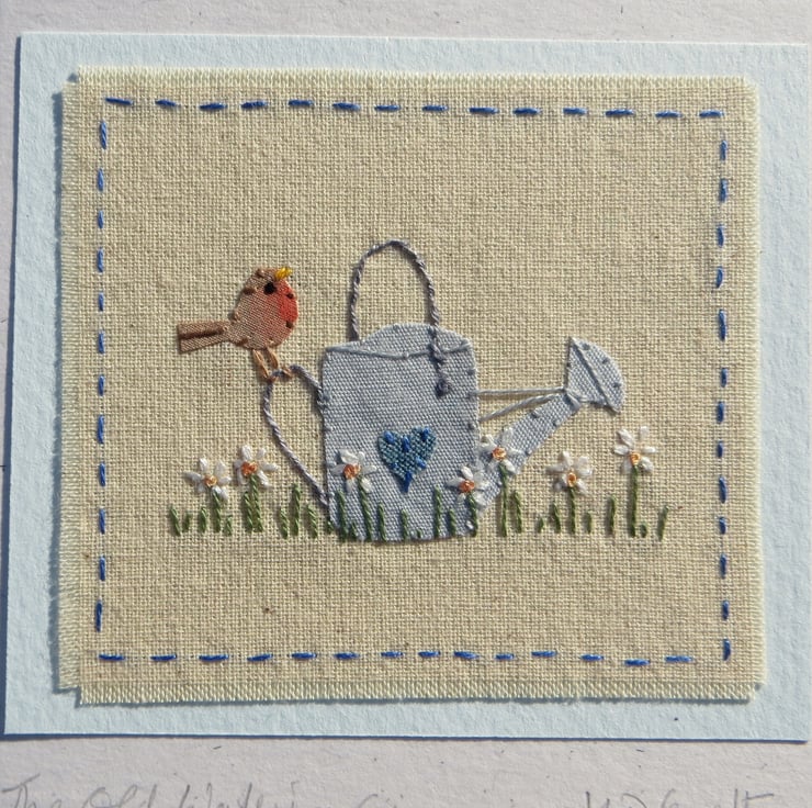 A hand-stitched textile miniature mounted onto greeting card, a gift in itself to keep as well as a card in which to write your message. I have cut the tiny applique watering can by hand and stitched it into position with the addition of embroidered details. A little robin perches on the handle and I have embroidered daisy flowers. I have used my own hand dyed recycled cottons to make this miniature textile.
