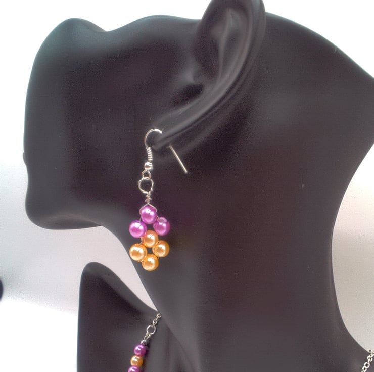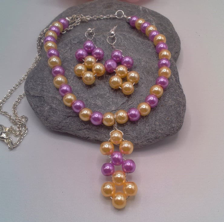 This pretty pink and lemon pearl jewellery set comprises a necklace and a pair of earrings. It is made using 6 mm pink and lemon pearls. The necklace has a central section of alternate pink and lemon pearls which is 7 inches (18 cm) long and some of the pearls are woven together to form a pendant for the necklace. The necklace is finished with 5.5 inches (14 cm) of silver plated chain at either end and is fastened with a silver plated lobster clasp.The earrings have the pearl pendants, as used for the necklace, suspended on silver plated ear wires. The necklace measures 18.5 inches (47 cm) with a drop of 1.5 inches (4 cm) for the pendant, the earrings have a drop of 1.25 inches (3 cm) from the base of the ear wire. The set jewellery set will be dispatched wrapped in tissue paper in an organza bag and delivered via Royal Mail first class post.