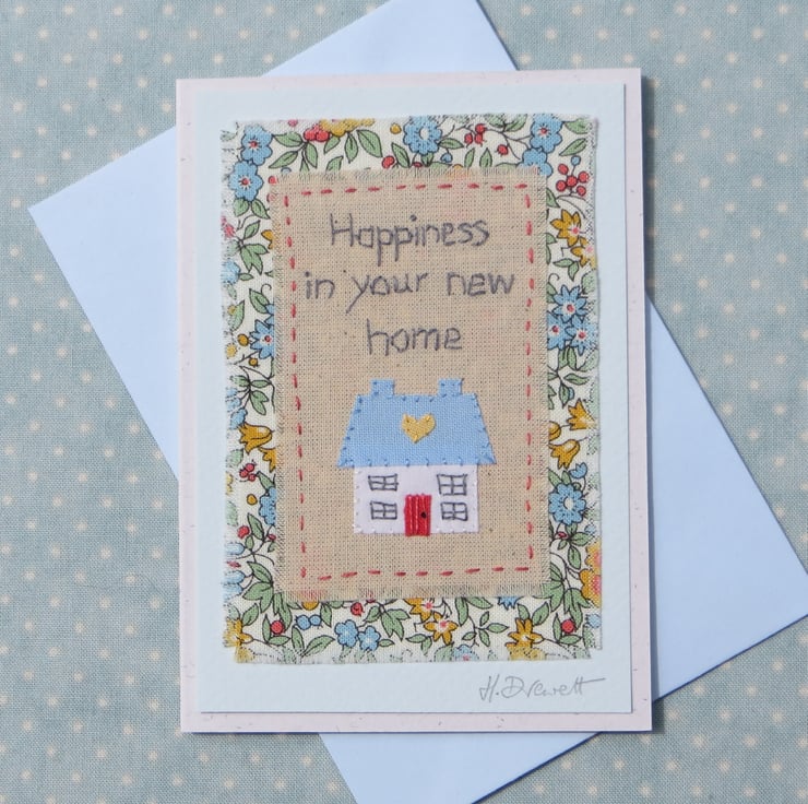 A handmade greeting card featuring a hand-stitched miniature applique house with stitched wording, backed with a beautiful Liberty cotton fabric. Perfect way to send your love and best wishes to anyone moving to a new home. (would look lovely framed too!).