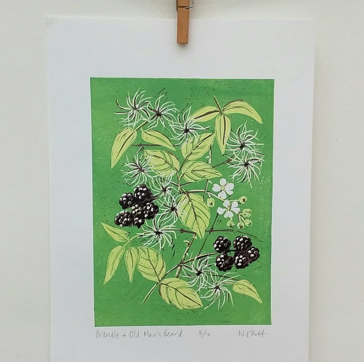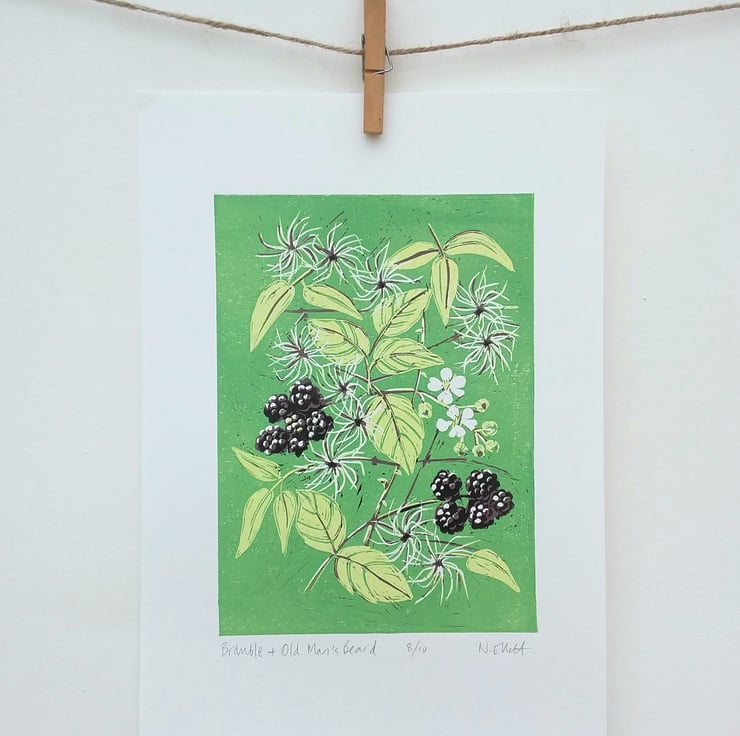 'Bramble and Old Man's Beard ' a four colour reduction linoprint in green on white.