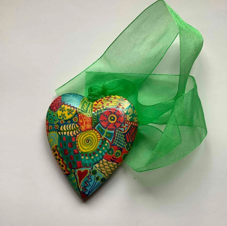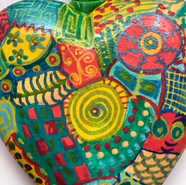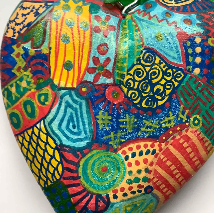 This wooden heart is hand painted in abstract patterns and varnished on both sides.