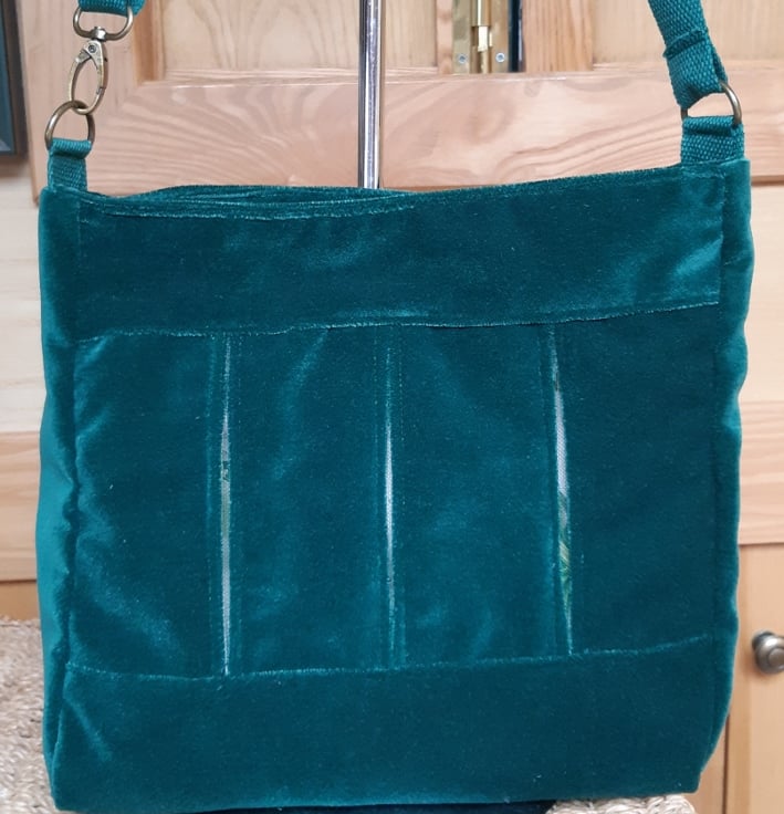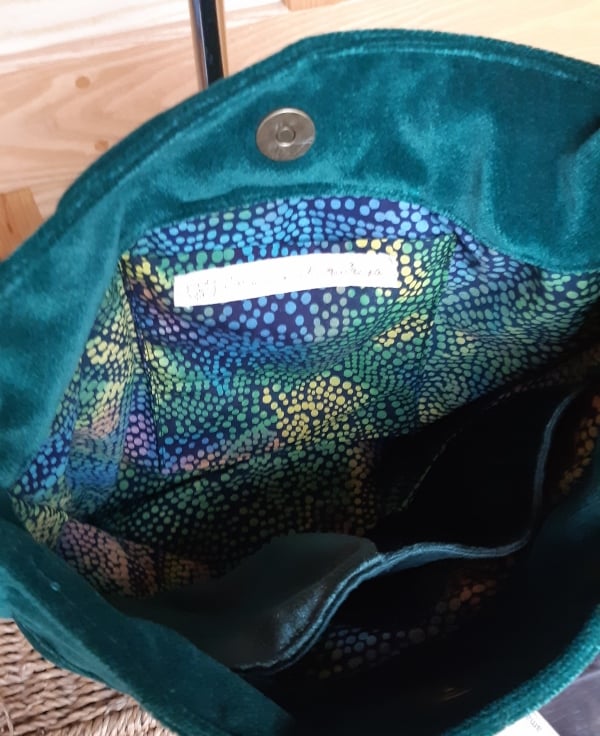 Soft forest green bag in a dense cotton velvet, with box pleats which expand to reveal the linen print behind. Lined in cotton batik print, with inner pockets, magnetic fastener, and adjustable cotton webbing strap which will go crossbody if required.