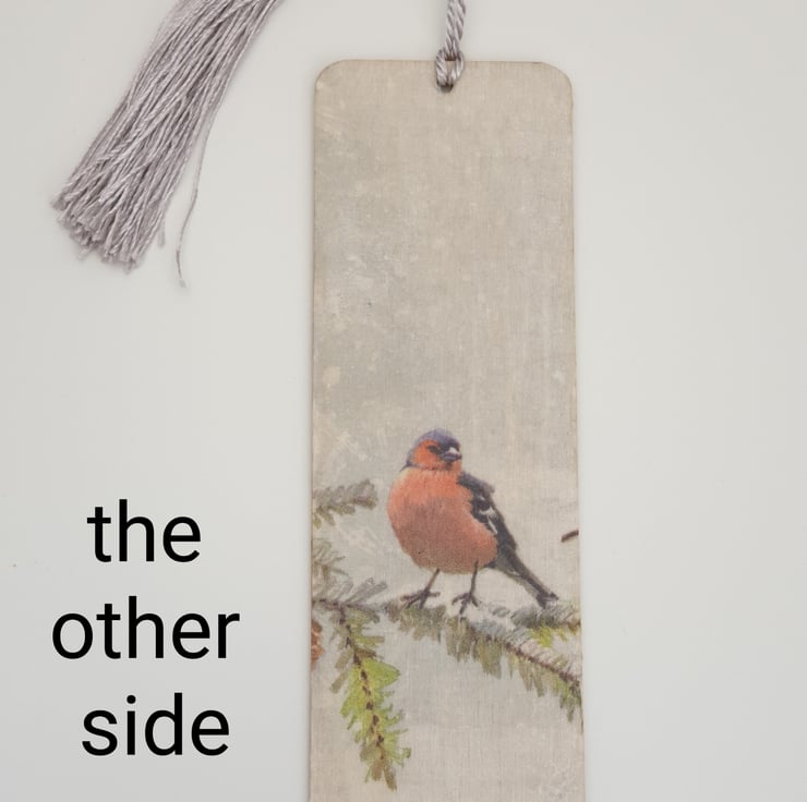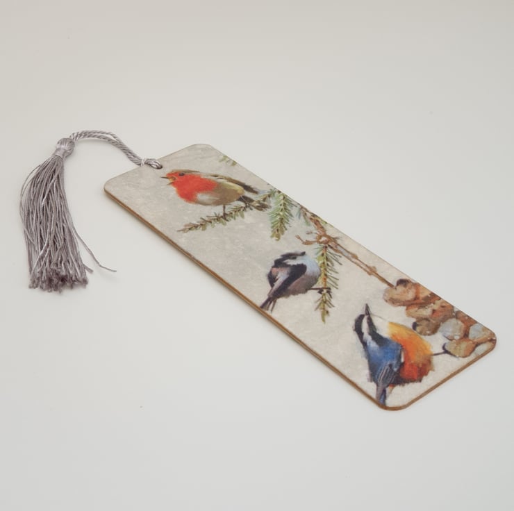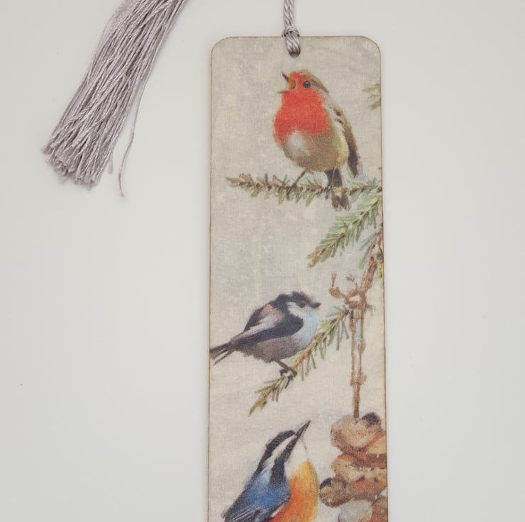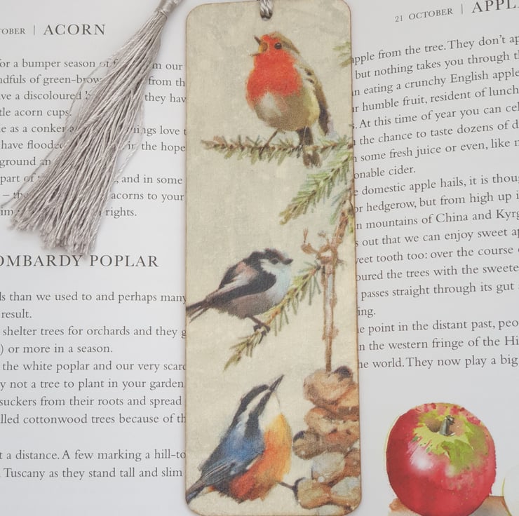Beautiful garden birds bookmark featuring a robin, long tailed tit and a nuthatch on the front and a chaffinch on the back. This decorative bookmark is made of wood and has been lovingly decoupaged and finished with a silver tassle.