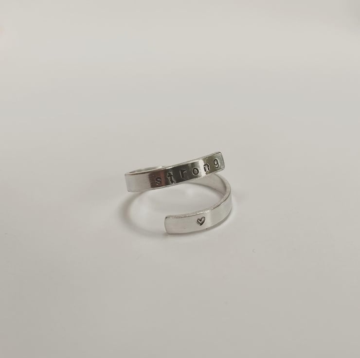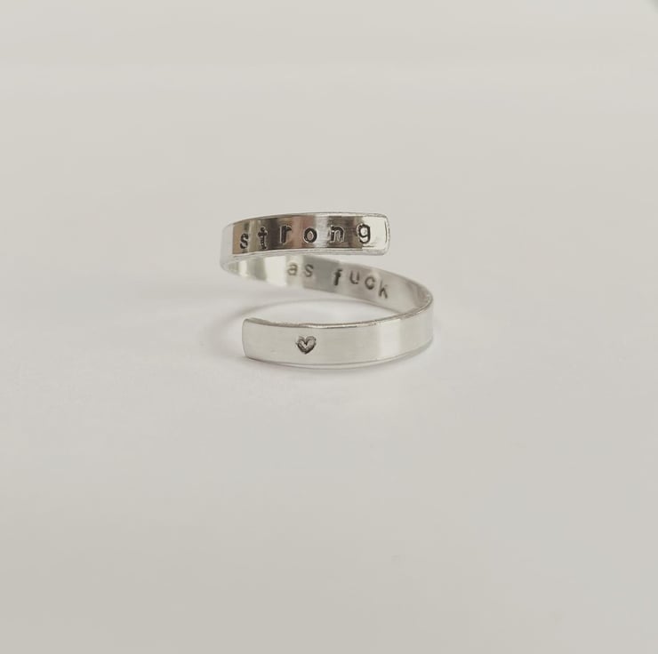 Aluminium wrap ring stamped with ‘strong’ on the outside and ‘as fuck’ hidden inside