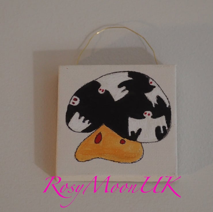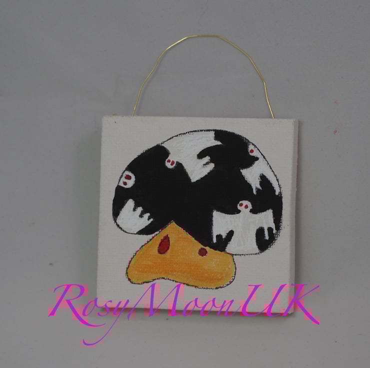 This scary toadstool is great for Halloween and has been drawn onto a 7x7cm miniature canvas, is hung using a copper wire and is sprayed with a fixative to prevent fading and smudging.