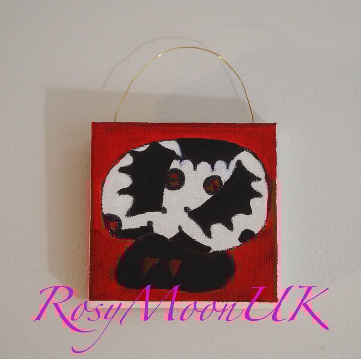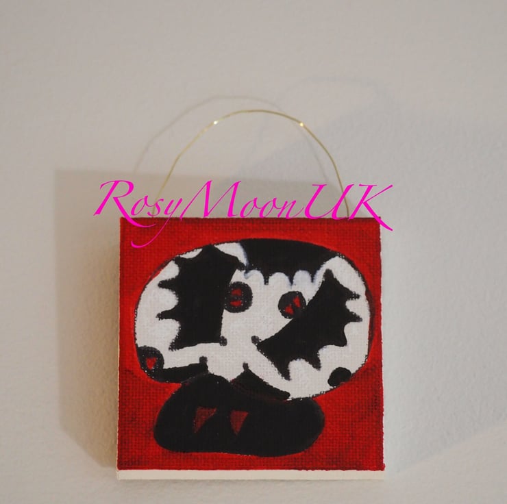 This scary toadstool canvas measures 7x7cm and is a one-off. The picture has been sprayed with a fixative spray to prevent smudging and fading.