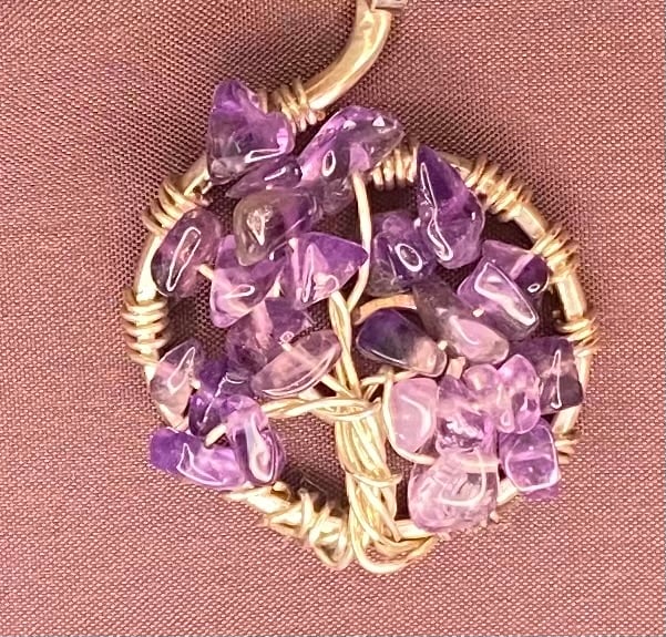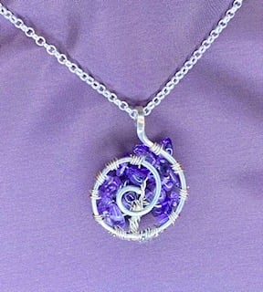 Amethyst and silver tree pendant set on a silver spiral. Measures 3cm x 4cm. Hangs on an 18"inch silver belcher chain.