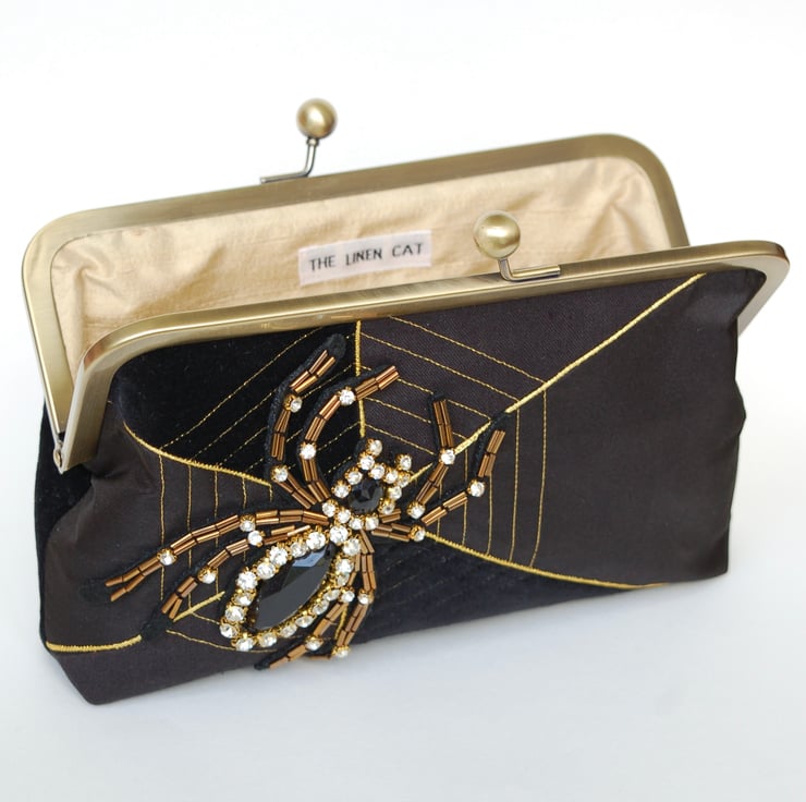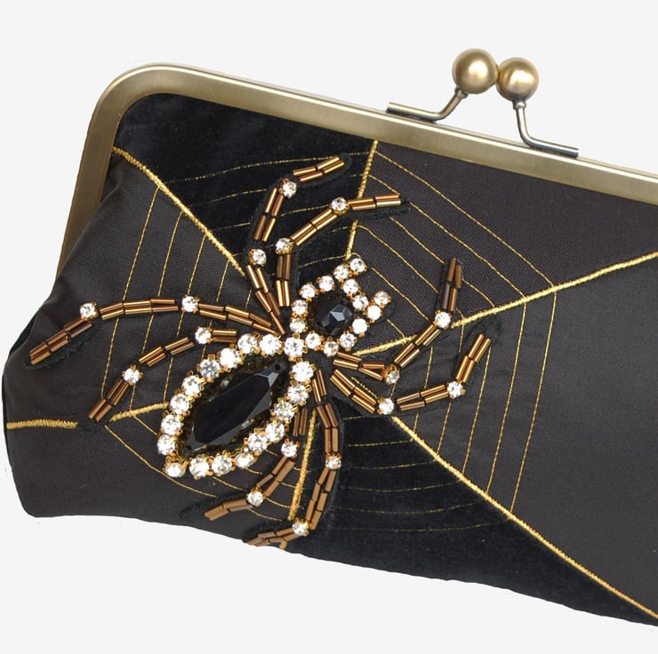 The purse is embellished with an appliquéd gold, black and diamanté beaded spider.