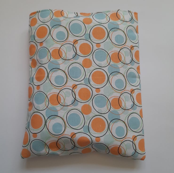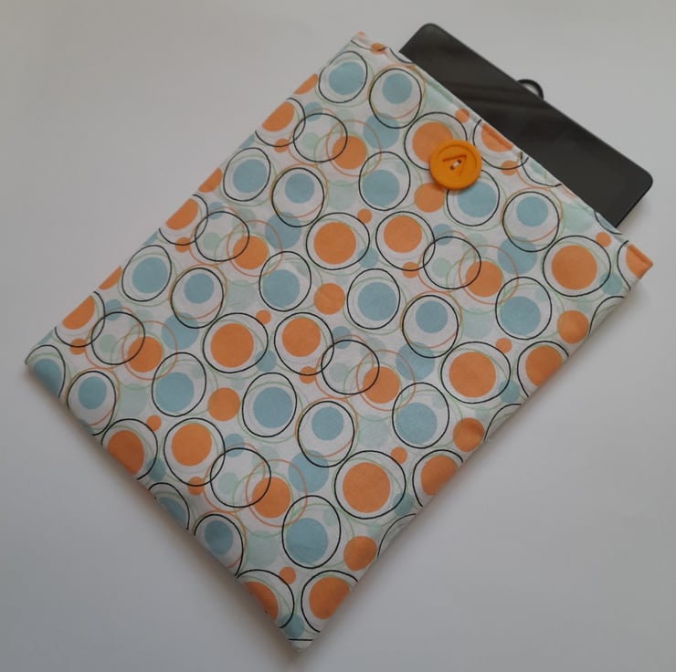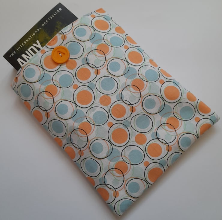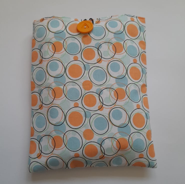 The sleeve is made out of a circle patterned cotton fabric in blue and orange on the outside and a white cotton fabric on the inside. The sleeve is padded for extra protection for your book and a button with elastic is used to close your sleeve