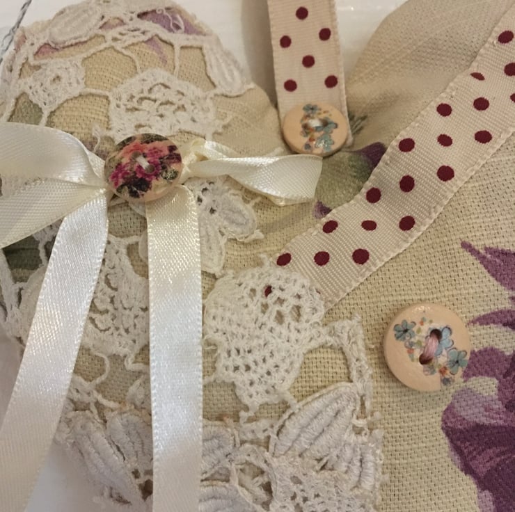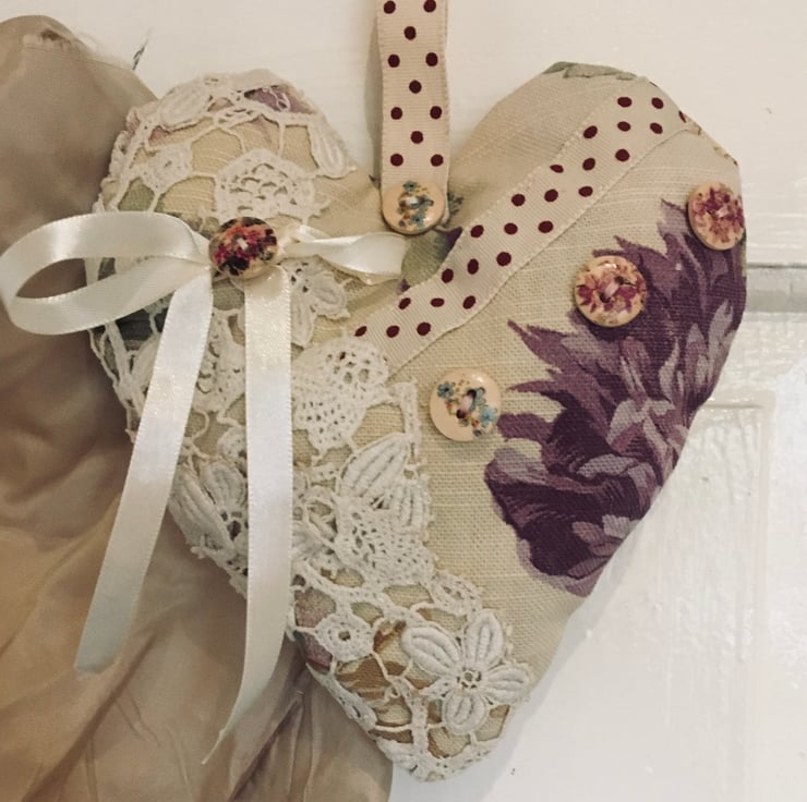 Hand made heart wall hanging. Lightly padded. Recycled and repurposed fabric and ribbons all merged together to creat a shabby chic heart. All unique and individual designs