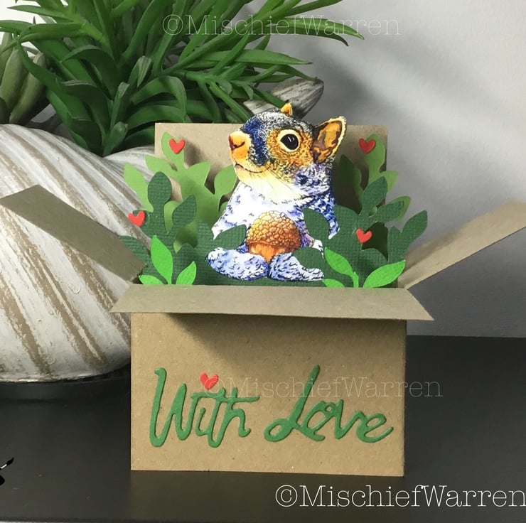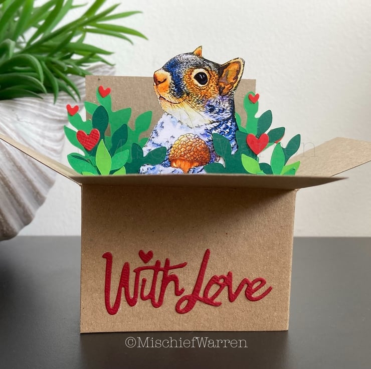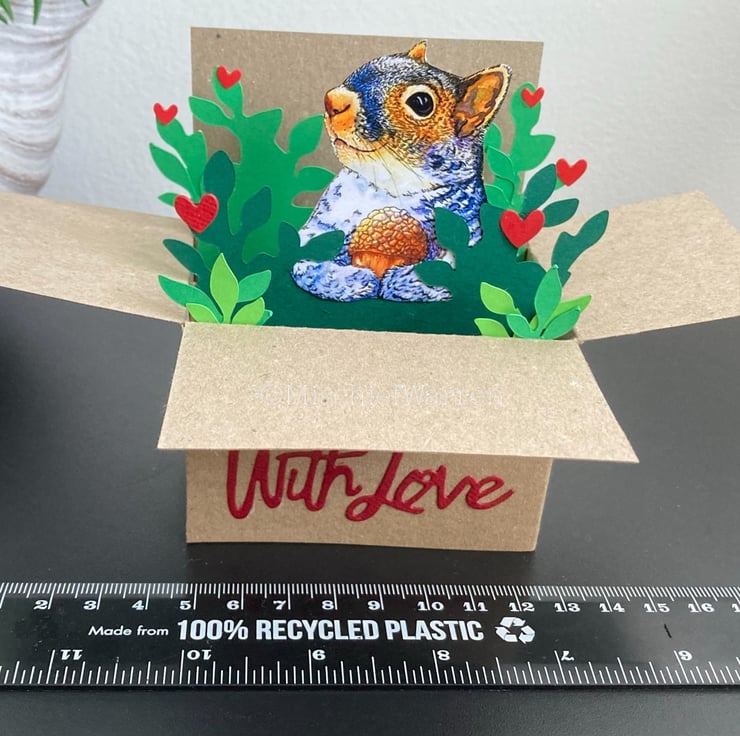 Squirrel card - with love. A cute grey squirrel peeking out from the greenery in this little box card, perfect for any animal lovers. This box card has been entirely designed and handmade by me here in a Devon, including my grey squirrel illustration. I’ve added “with love” cut from green or red card and some red card hearts. The box is recycled card and a white recycled card panel on the reverse allows for your own message (which I can add for you), or I can add a gift card pocket.
