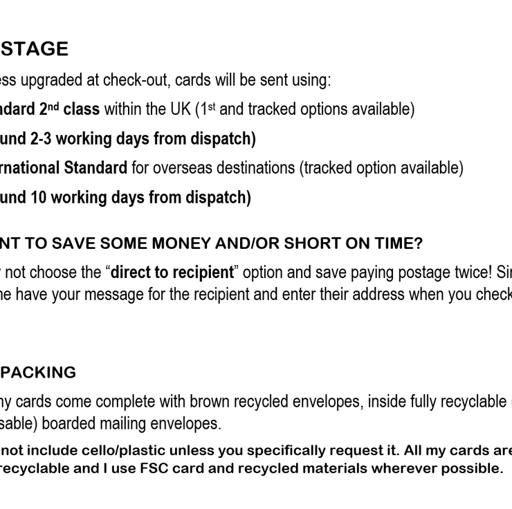 I am attempting to play a tiny part towards reducing single-use plastic and only send cards with a cello/plastic bag if you specifically ask.
