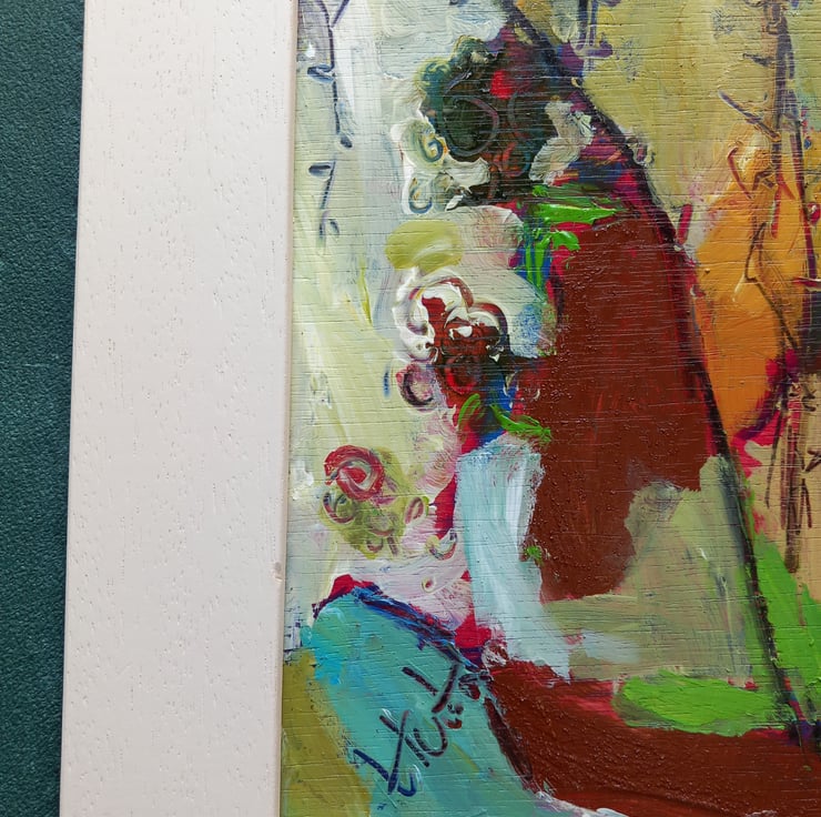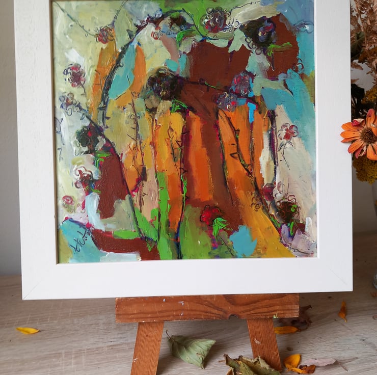 This strong semi abstract painting of brambles is full of the interesting texture of blackberry bushes. I want this painting to feel of autumn and all its richess. Painted on reclaimed wood and framed in sustainable wood, bespoke frame. Approx 36 cm square