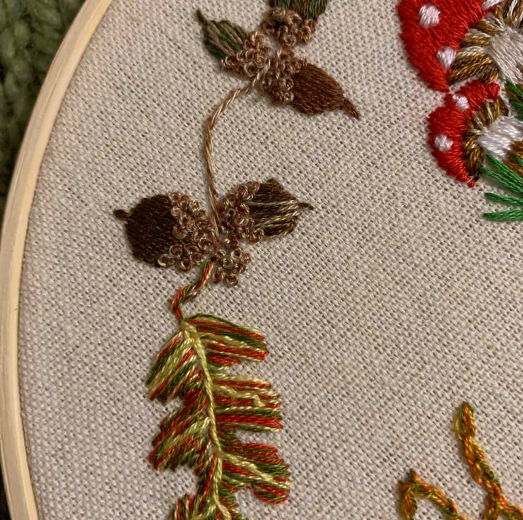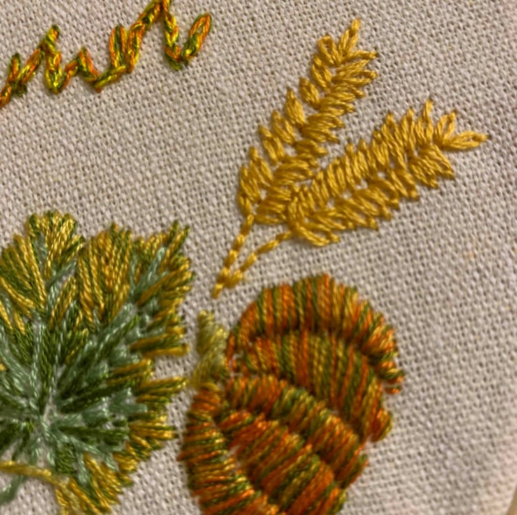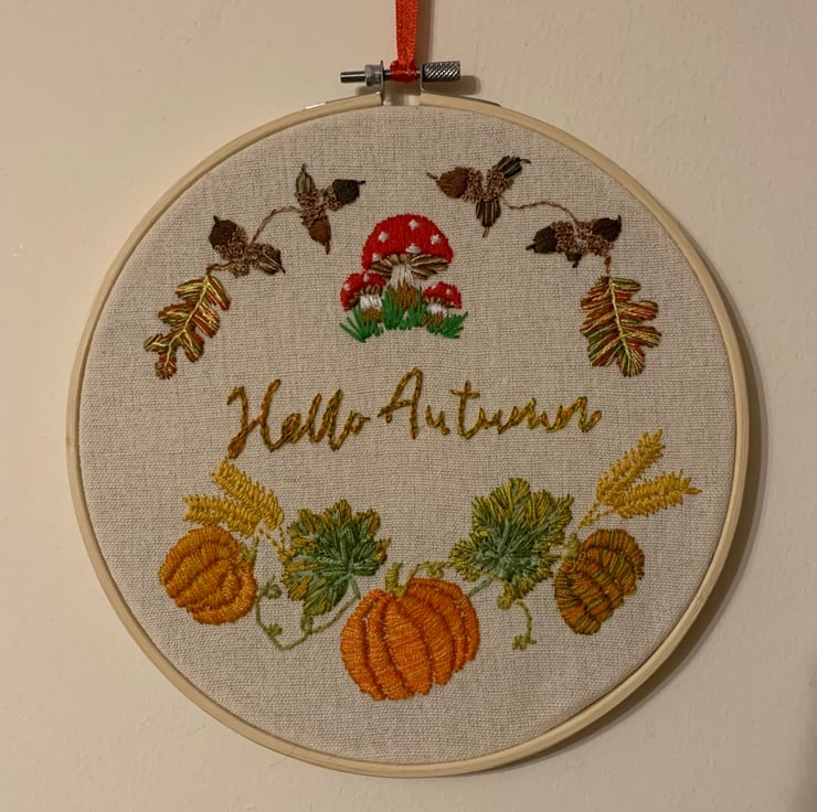 A beautifully detailed hand embroidered hoop welcoming Autumn, pumpkins, corn, toadstools and acorns all add to the autumnal feel. The backing is a coordinating felt, blanket stitched on, unlike some which are glued. A beautiful addition to your home, one you can bring out year after year to ring the changes. One in a series of seasonal hoops, and as hand embroidered no two will be exactly the same so please allow for this when ordering.