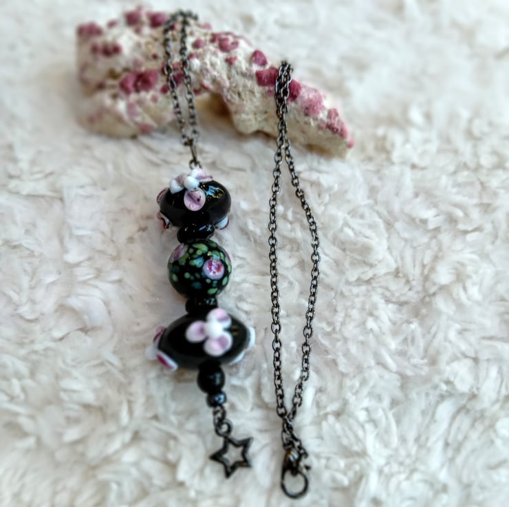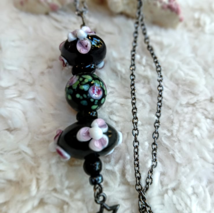 Carefully chosen floral Lampwork black rondelle and one globe black bead pendant, finished with a gunmetal open star charm, on gunmetal chain necklace. This piece is a one-off stunner, bound to wow at parties and special events.