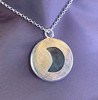 The moon draws many watchers and gazers, this pendant represents the full and crescent moon. The blue and green flashes in this stone are mesmerising just like the moon!