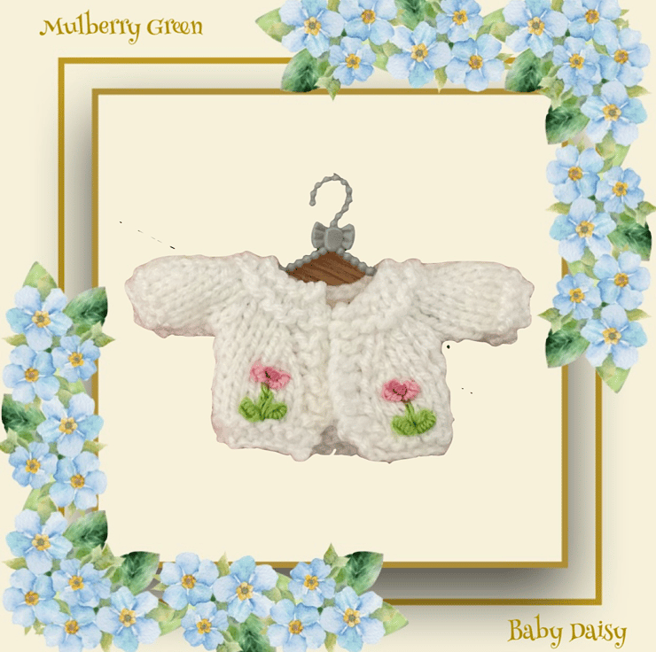 A pretty white cardigan, embroidered with pretty little flowers to fit baby Daisy. The cardigan is hand knitted and comes on a cute little hanger.