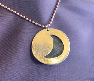 The pendant is 35mm in diameter and has a pierced crescent moon behind the stone to allow light through. It hangs on a 24" copper bead chain.