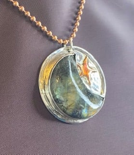 Circular silver pendant set with a crescent labradorite with a copper star embellishment.