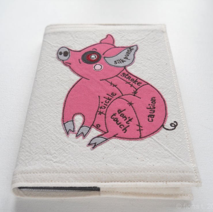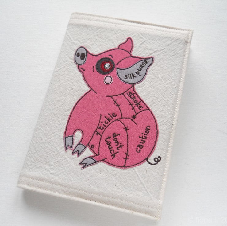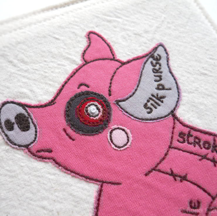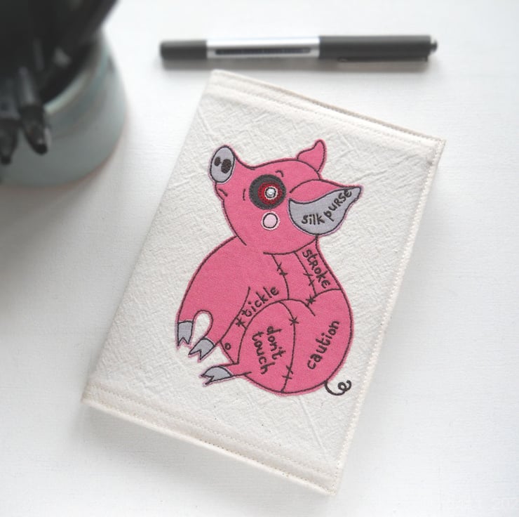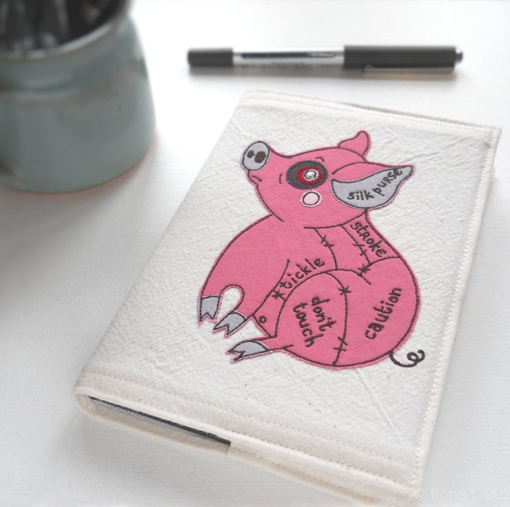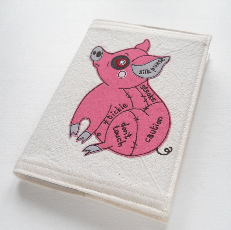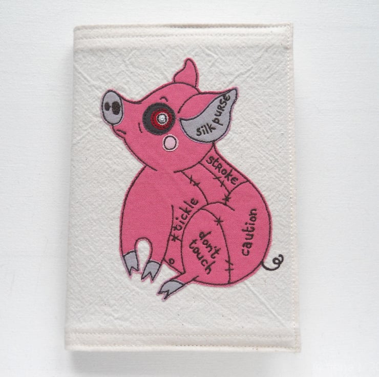 applique & freehand embroidered zombie piglet notebook cover with A6 sketchbook inside.