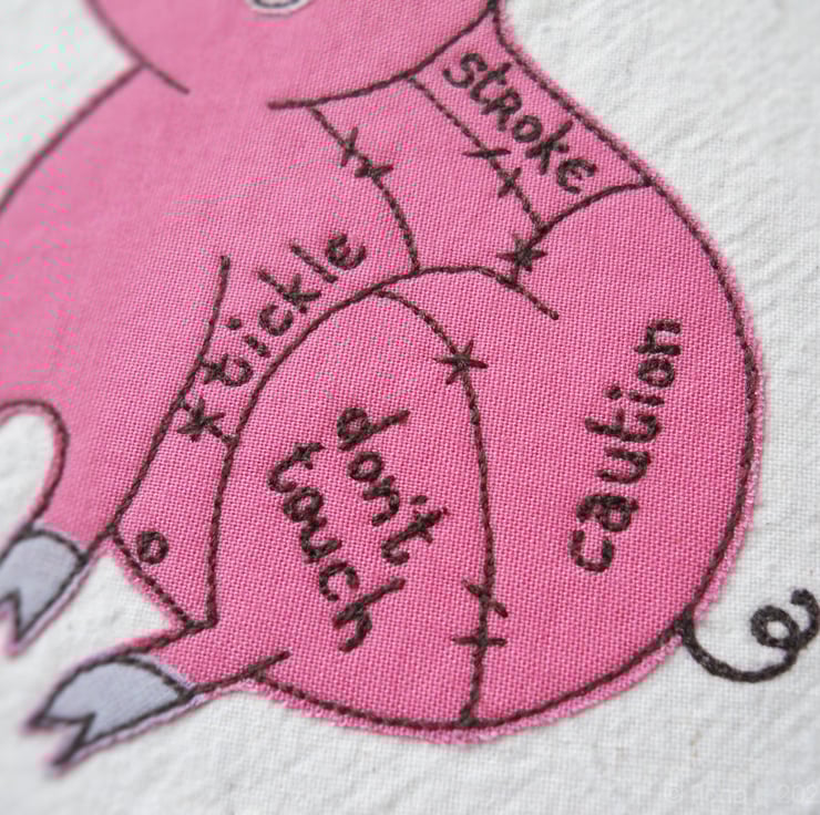 piglet is cut from blush pink cotton and hand dyed corpse grey cotton lawn. each piece of fabric is hand-cut, layered & appliqued onto cotton calico to build up the image, before “drawing” the intricate details – including the text - on freehand, using free motion embroidery.