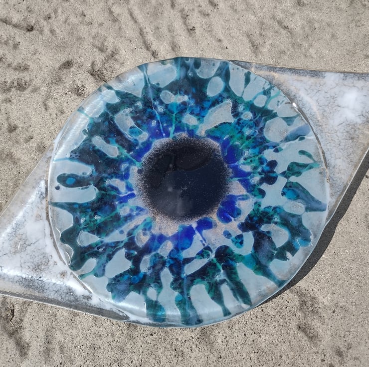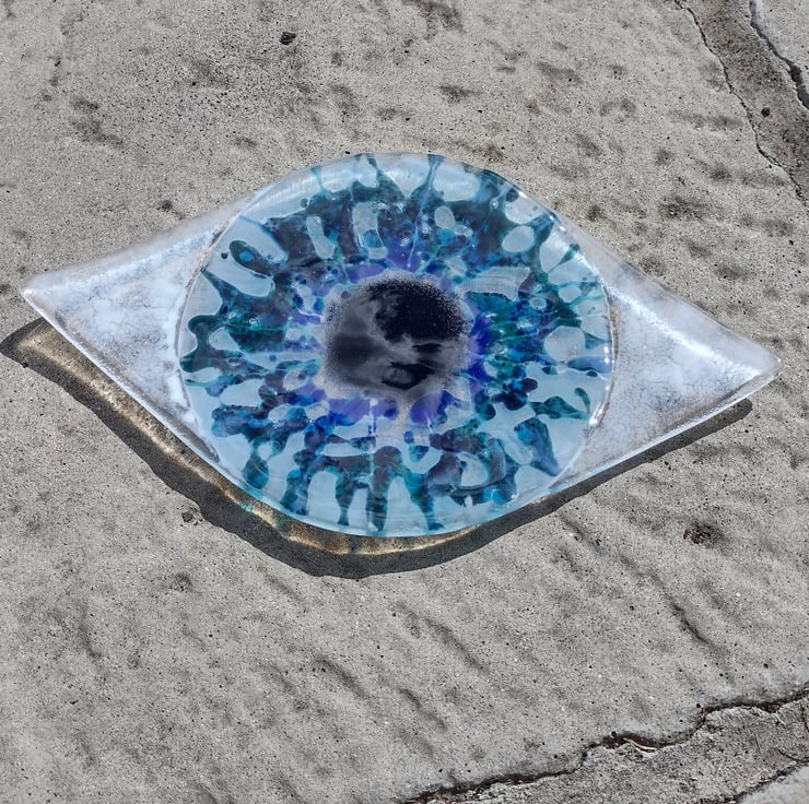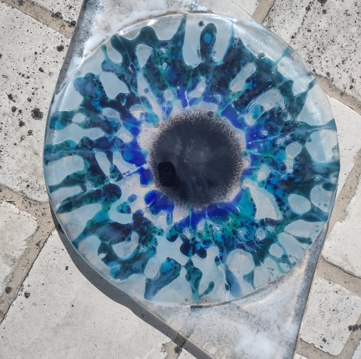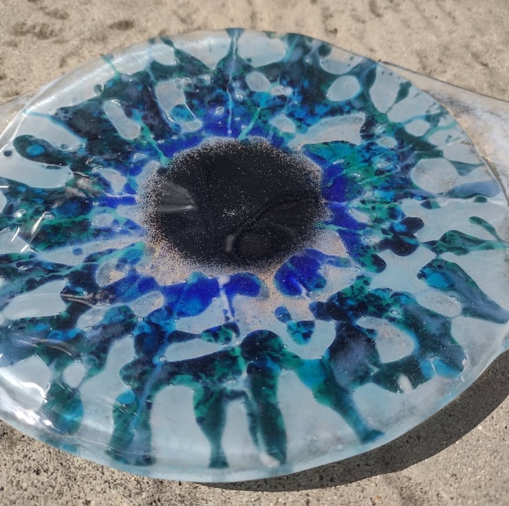 This unusual decorative plate is made from layers of glass fused together then slumped into shape. Multiple kiln firings have formed this interesting piece.