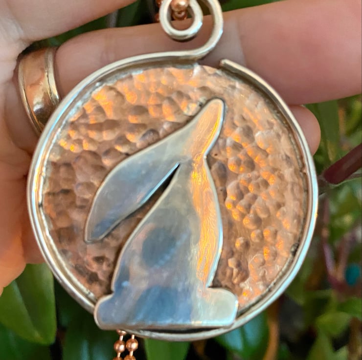 A circular pendant featuring a beaten copper full moon and silver gazing hare. It measures 40mm in diameter and hangs on a 24" copper bead chain.