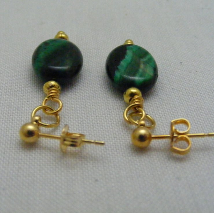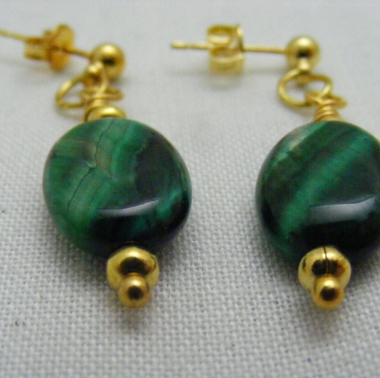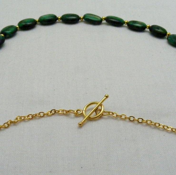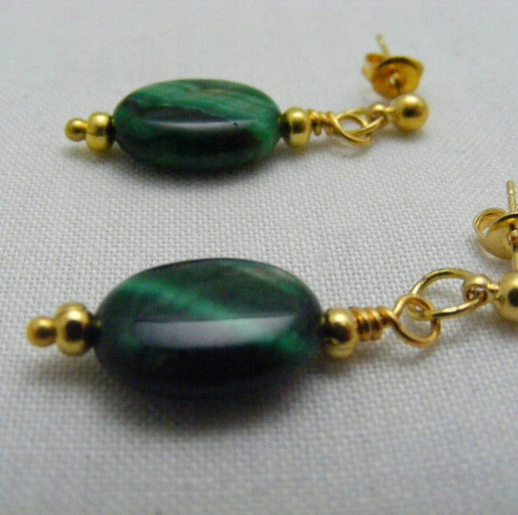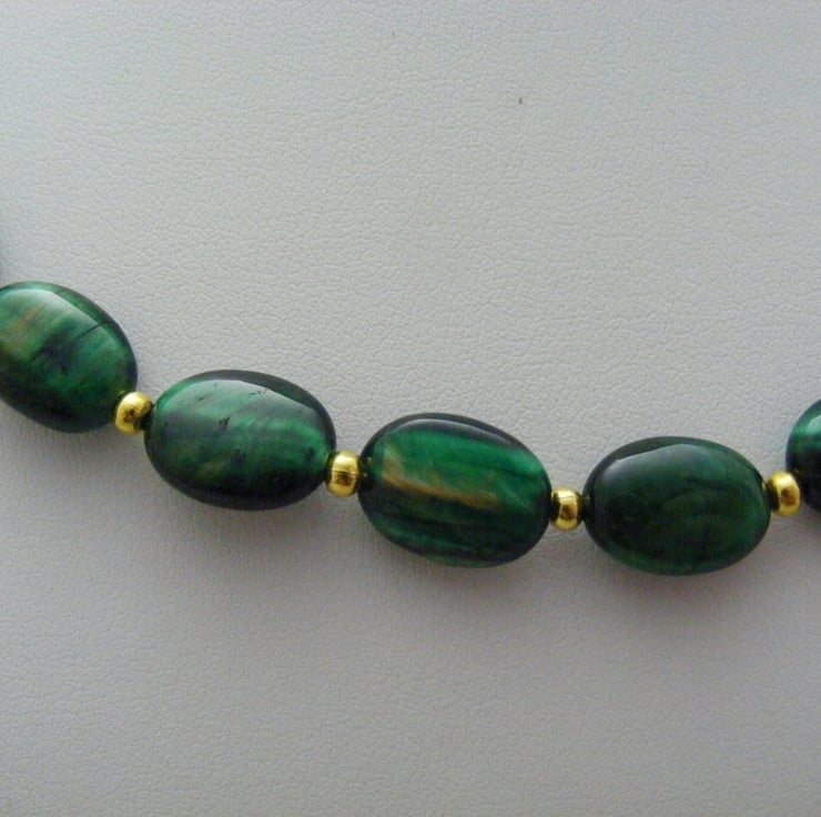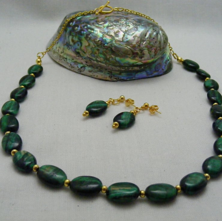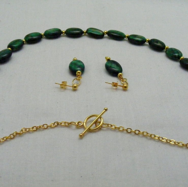 One of a kind, gemstone jewellery set comprises of a necklace with matching earrings. Set is handmade with, 14x15mm green tiger's eye ovals, 4mm gold plated spacers, gold plated chain, findings, toggle clasp and ear studs.