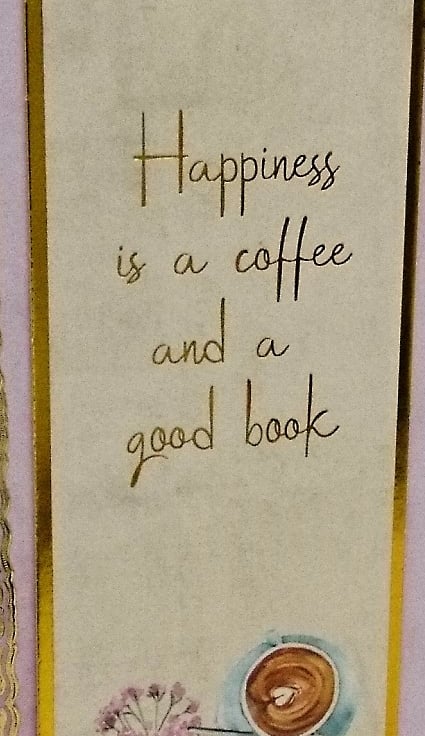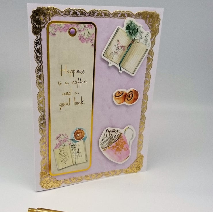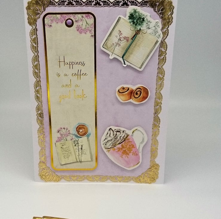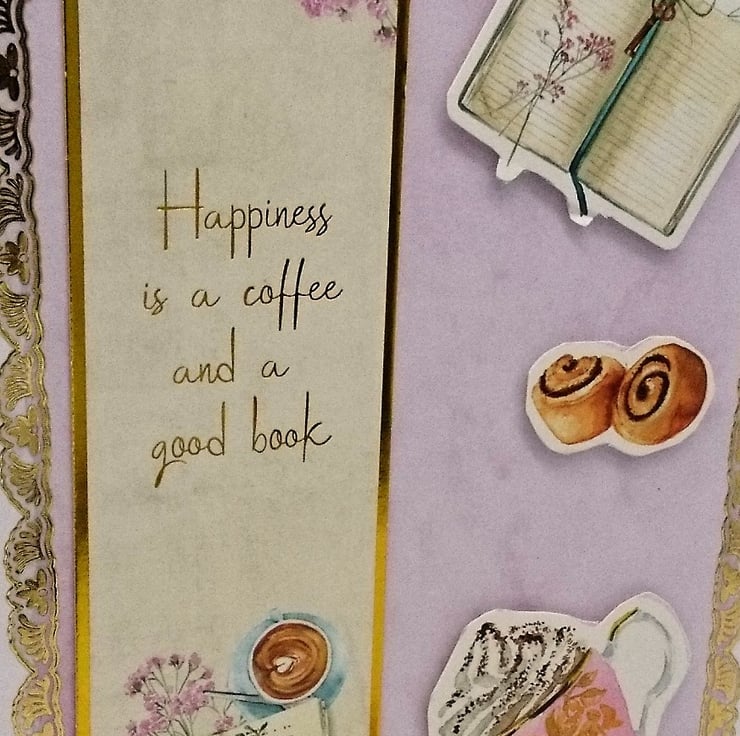 White card layered with pink and decorative gold panel, embellished with raised coffee mug, cinnamon buns and open book. The bookmark is easily detached and reads "Happiness is a coffe and a good book" All my cards are handmade with love, in my wee studio in Dunoon, Argyll, Scotland.