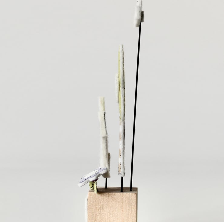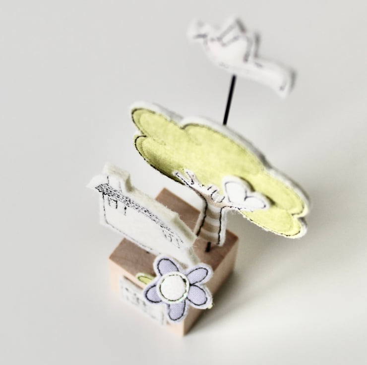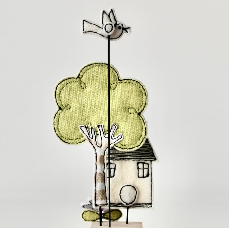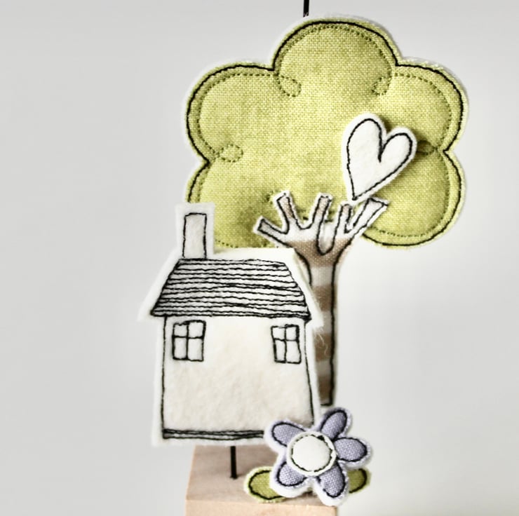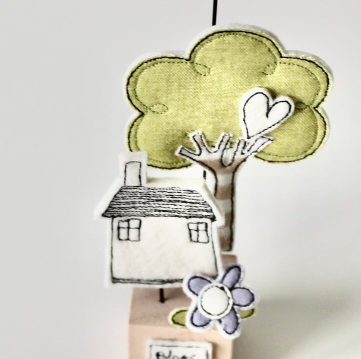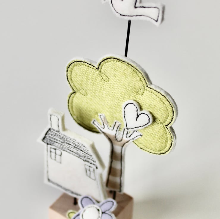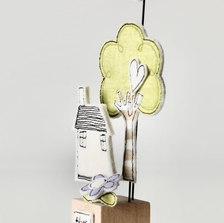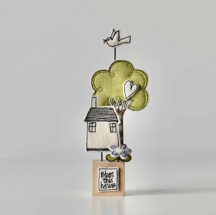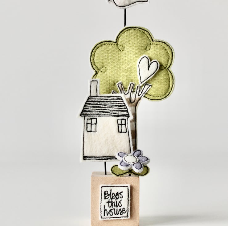 The house, tree, heart, flower, birdie and 'Bless this house' label are sewn using 100% wool felt, cotton cloth and free hand machine embroidery; multiple layers of cloth are sewn together and cut out by hand using sharp scissors. Mounted on a 3cm cube wooden block which can adorn a mantle piece or any flat surface.